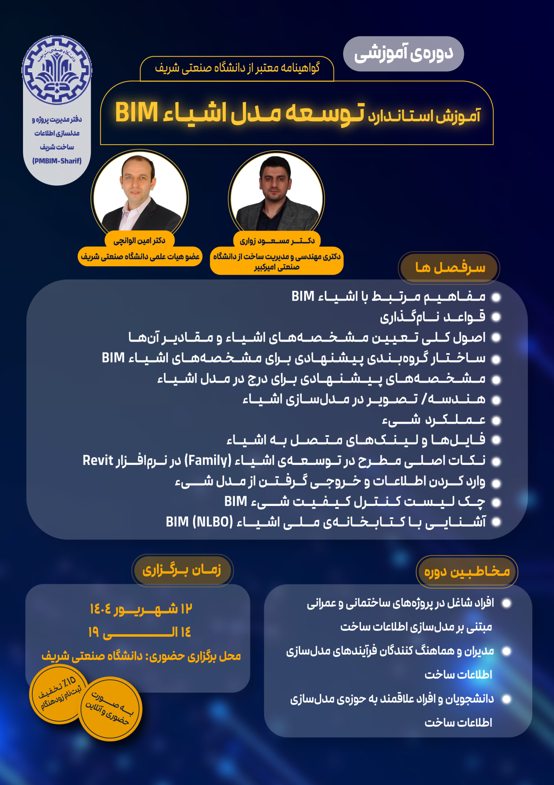 *** توجهاگر به هر دلیلی امکان پرداخت کامل شهریه دوره‌ها را ندارید، کافی‌ست با ما در ارتباط باشید. با هم راهی برای حضور شما در مسیر آموزش و پیشرفت پیدا خواهیم کرد. ما در دفتر مدیریت پروژه و اطلاعات ساخت شریف همیشه کنار شما هستیم.